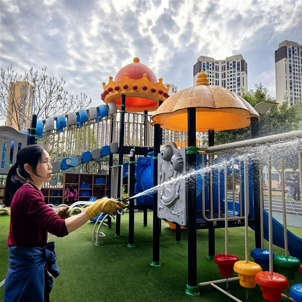 大厅的玻璃擦得透亮,走廊的地面一尘不染,楼梯扶手反复擦拭消毒;户外的滑梯、攀爬架等大型游乐设施,经过清水冲洗、消毒液擦拭、阳光晾晒的“三重洗礼”,焕然一新;园区的绿植被修剪得整整齐齐,枯萎枝叶尽数清理,让春日的校园更显生机盎然。从室内到户外,从主干道到隐蔽角落,我们用脚步丈量责任,用行动守护洁净。